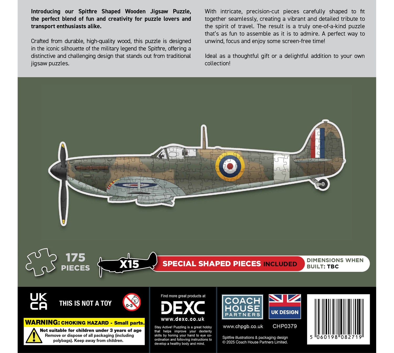 Crafted from durable, high-quality wood, this puzzle is designed in the iconic silhouette of the military legend the Spitfire, offering a distinctive and challenging design that stands out from traditional jigsaw puzzles.