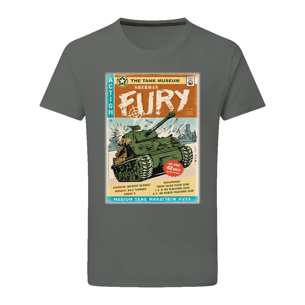 This charcoal coloured t-shirt features The Tank Museum's famous Sherman Fury in a dynamic comic style, perfect for tank fans.