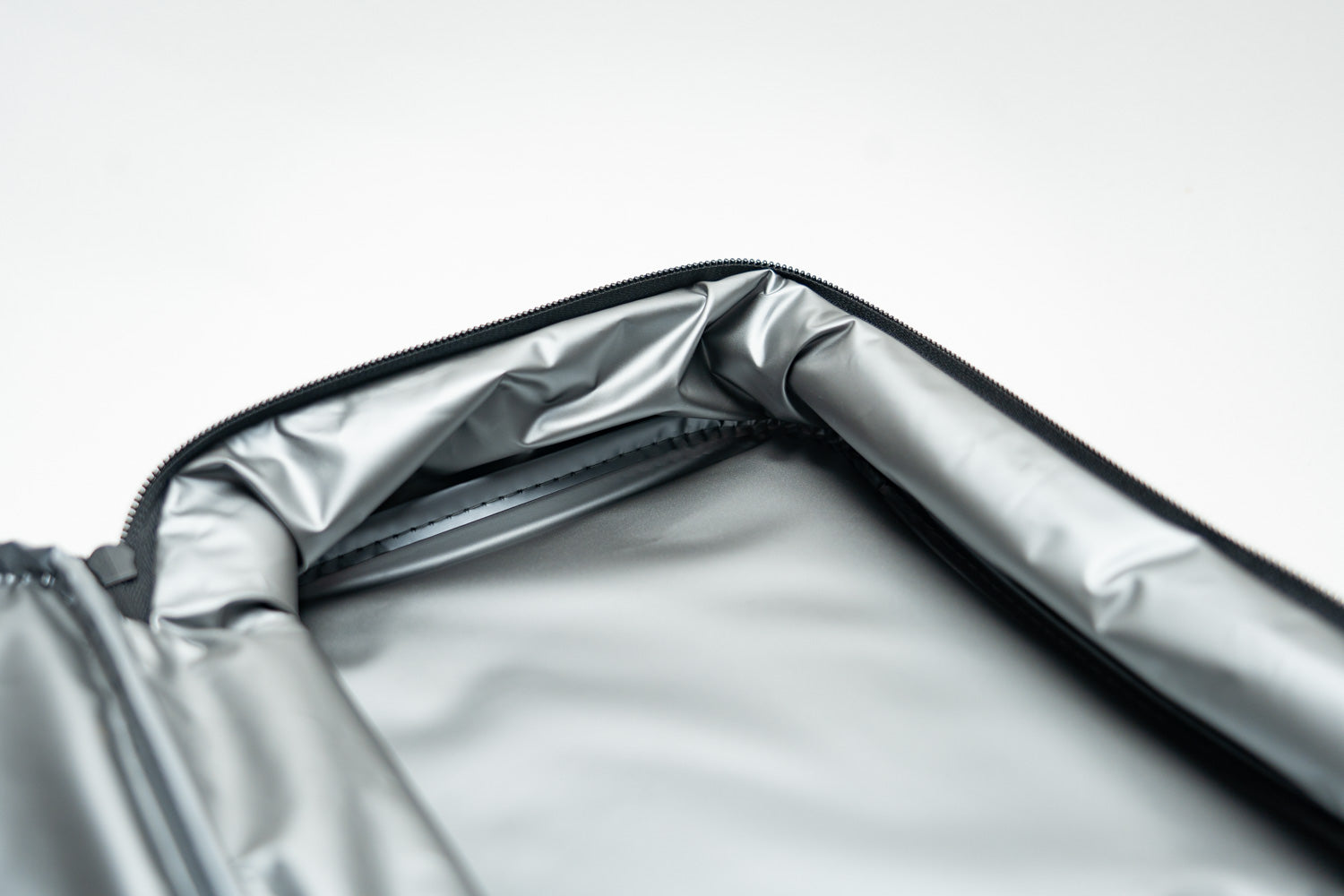 Polyester outer and EVA plastic wipeable lining with a zip around 3 sides creating a full opening