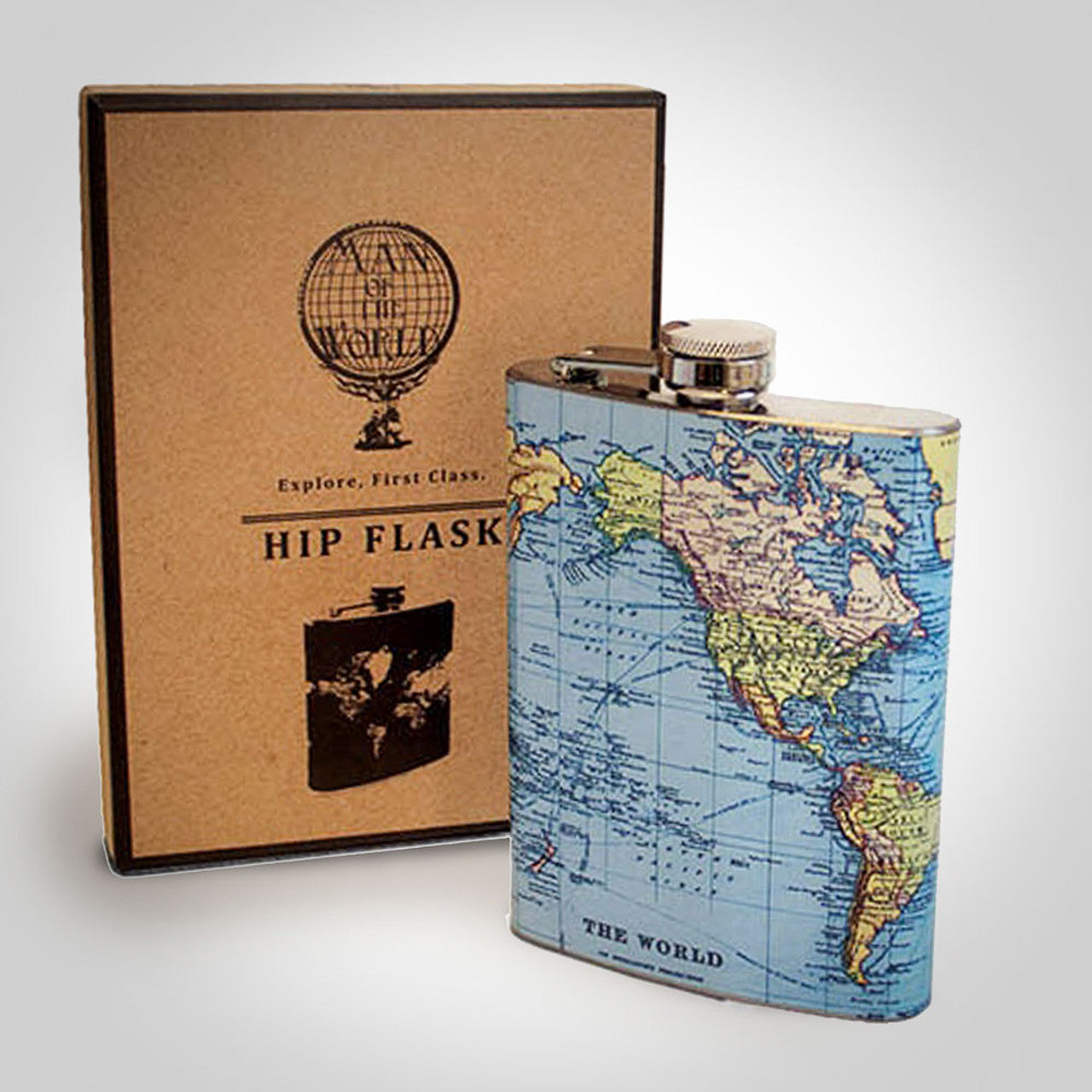 This durable hip flask emblazoned with a world map is the ideal side kick for any worldly man who doesn't have the time to finish a drink in any given location.