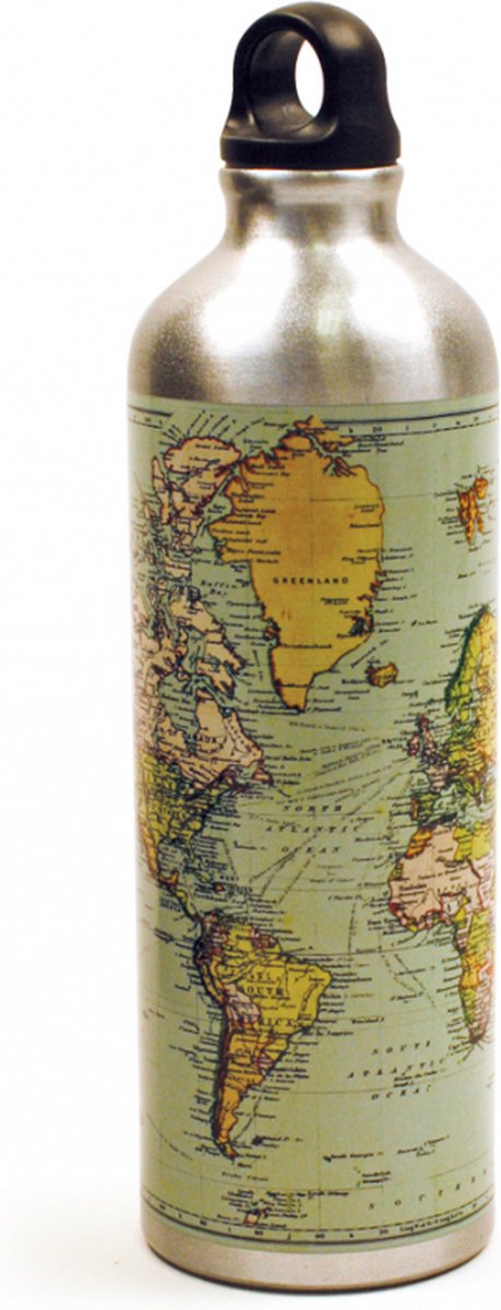 Chrome 750ml water bottle featuring a classically coloured vintage world map printed section. Aluminium 750ml.