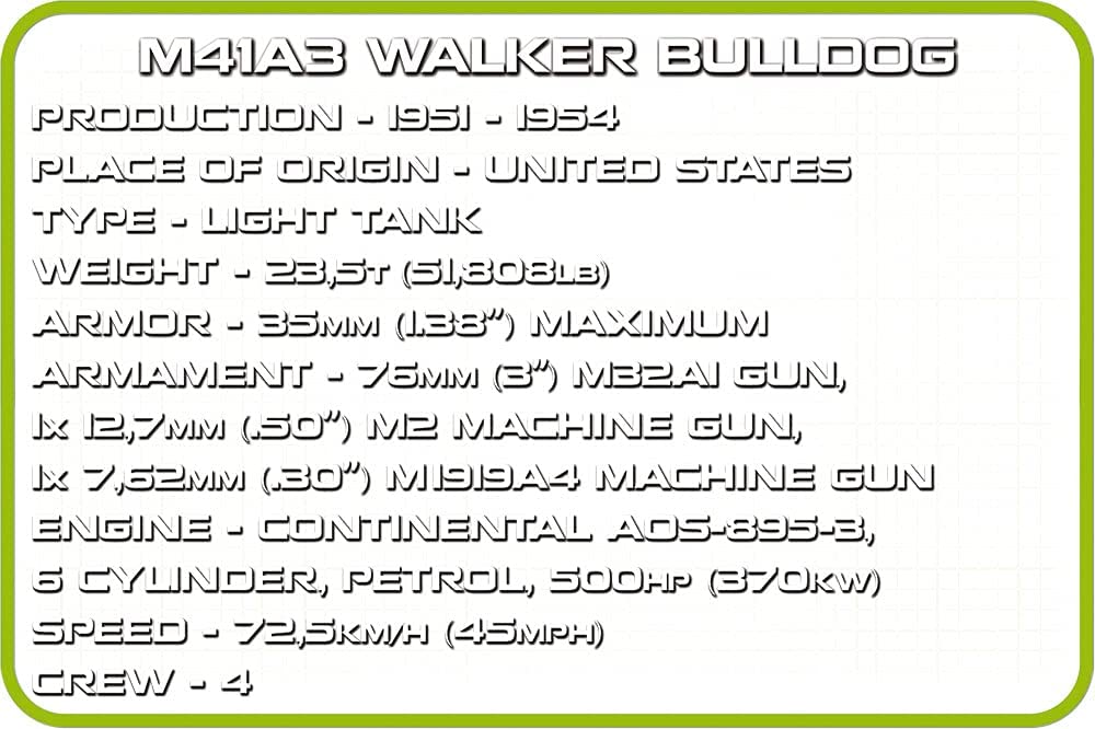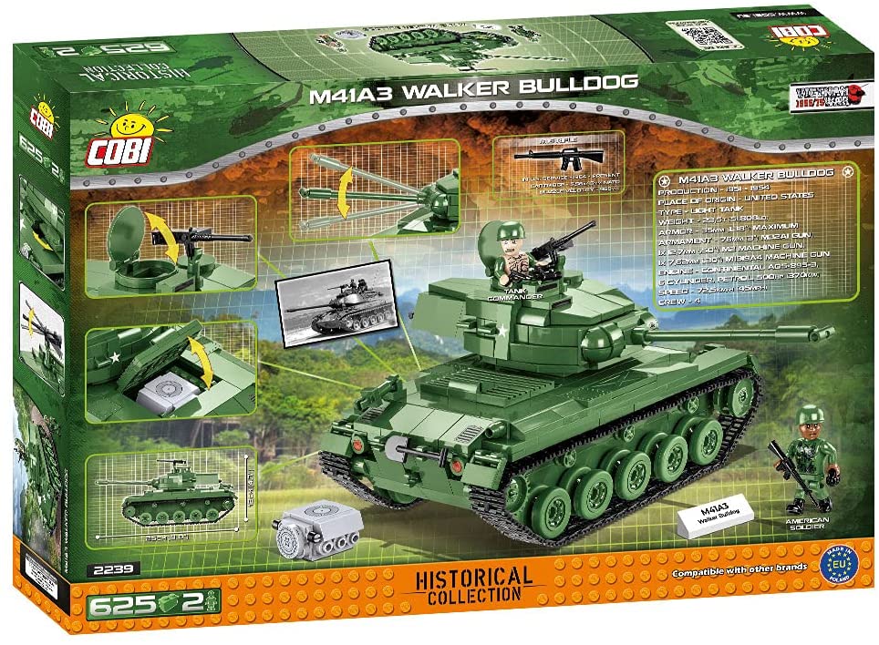 Cobi M41A3 Walker Bulldog. You can build the American M41A3 Walker Bulldog light tank from a set of 605 COBI construction blocks. The model contains elements covered with high-quality pad-prints. The design perfectly reflects the original shapes of its historical prototype.