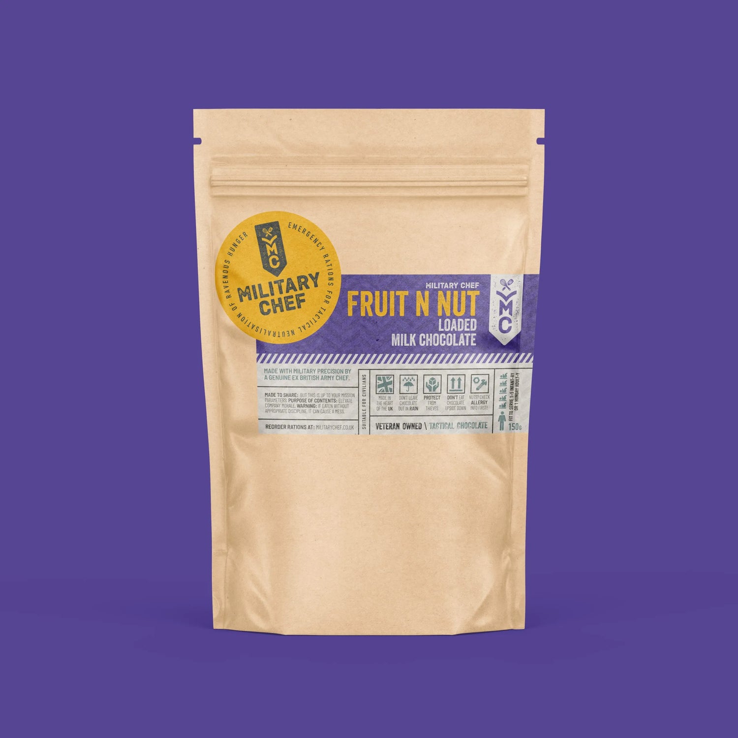 Deliciously crafted 150g of Fruit N Nut loaded milk chocolate, sealed in a handy pouch, created by our friends at Military Chef!