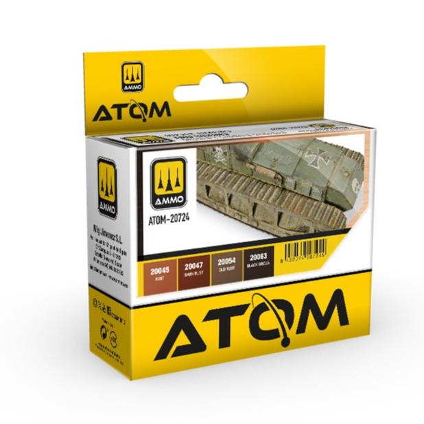 ATOM acrylic paint set designed for painting rust and tracks. It contains the necessary shades to achieve the typical rust finish of armoured vehicle tracks, among others. With these colours, you can also simulate any type of rusted metal or accessory used for models or dioramas. This set includes colours that can be used as a base, as well as different light and dark shades for creating various effects.