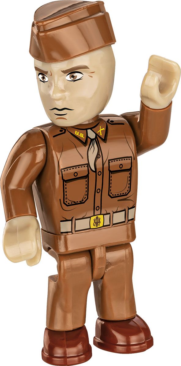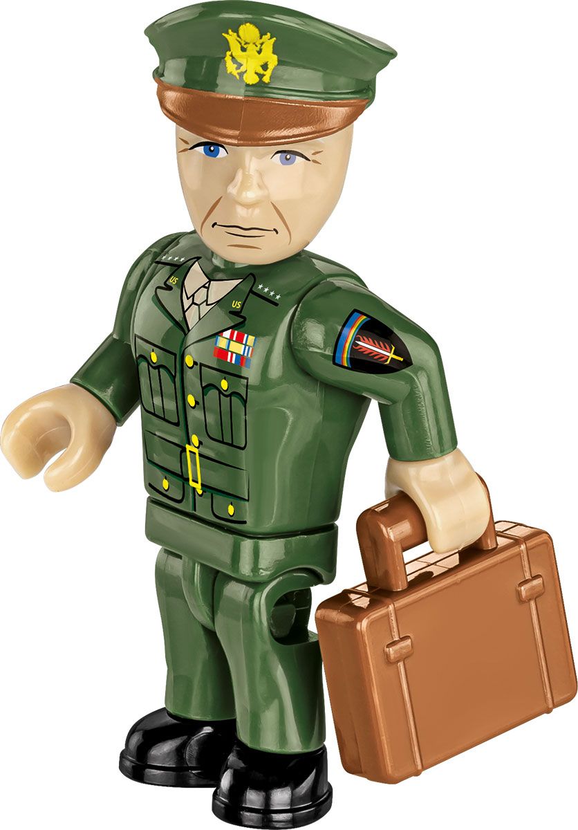 The Dodge WC 56 Command Car released under the RAM license is an American command car used for transporting officers and communicating on the battlefield during World War II. The block model was developed in a scale of 1:35 and contains many prints based of historical markings from 1944. A special block in the shape of a characteristic radiator grille was developed for Dodge cars. The model has rotating wheels with rubber tires and places to attach figures. The set also includes two soldier figures. The accurately recreated American general is based on an authentic historical figure. He is accompanied by a military driver.