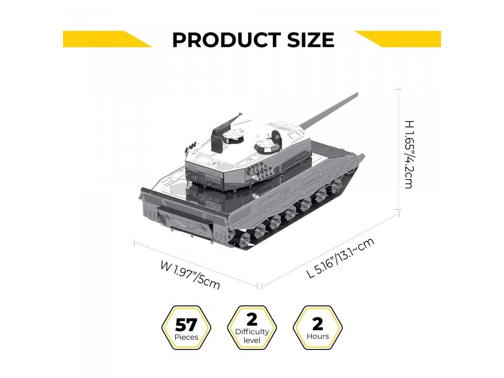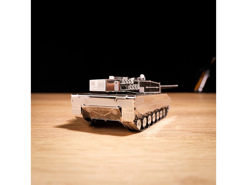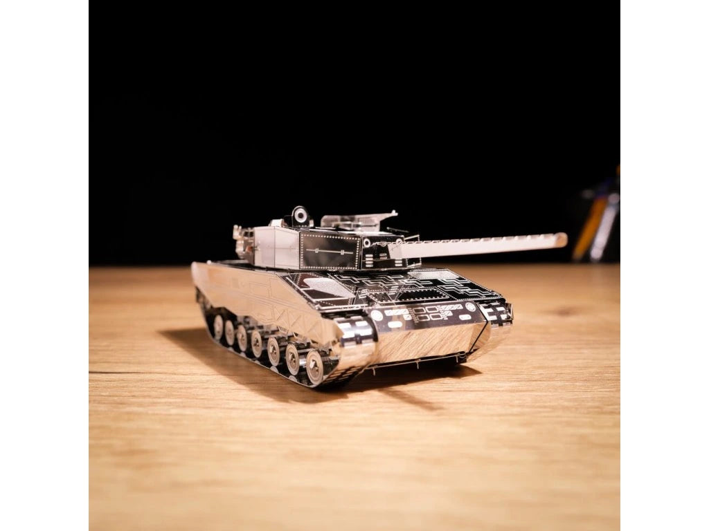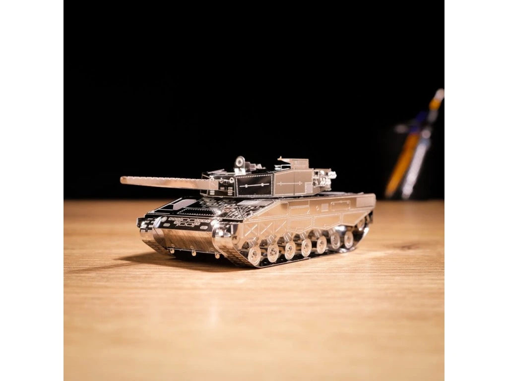 Metallic model kit. Made of high-quality polished steel sheet by laser burning and precise machining. Suitable for moderately advanced and older children. When completed, the overall length will be approximately 131mm, the overall width approximately 50mm, and the overall height approximately 42mm. Realistic design with movable turret, six wheels, details such as hatches, grilles, weapon system – all captured by electrochemical etching.
