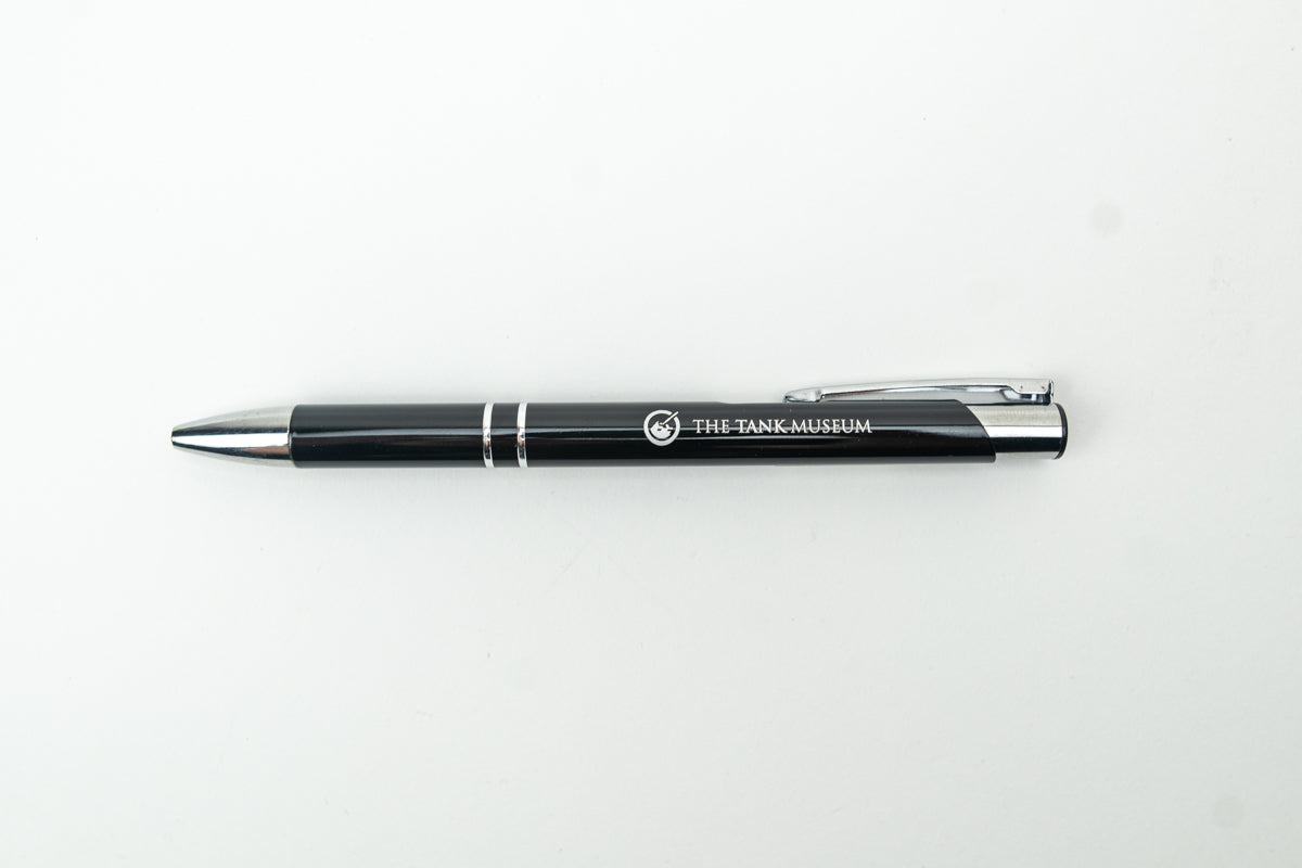 A ballpoint pen with black ink with The Tank Museum logo on the side in silver