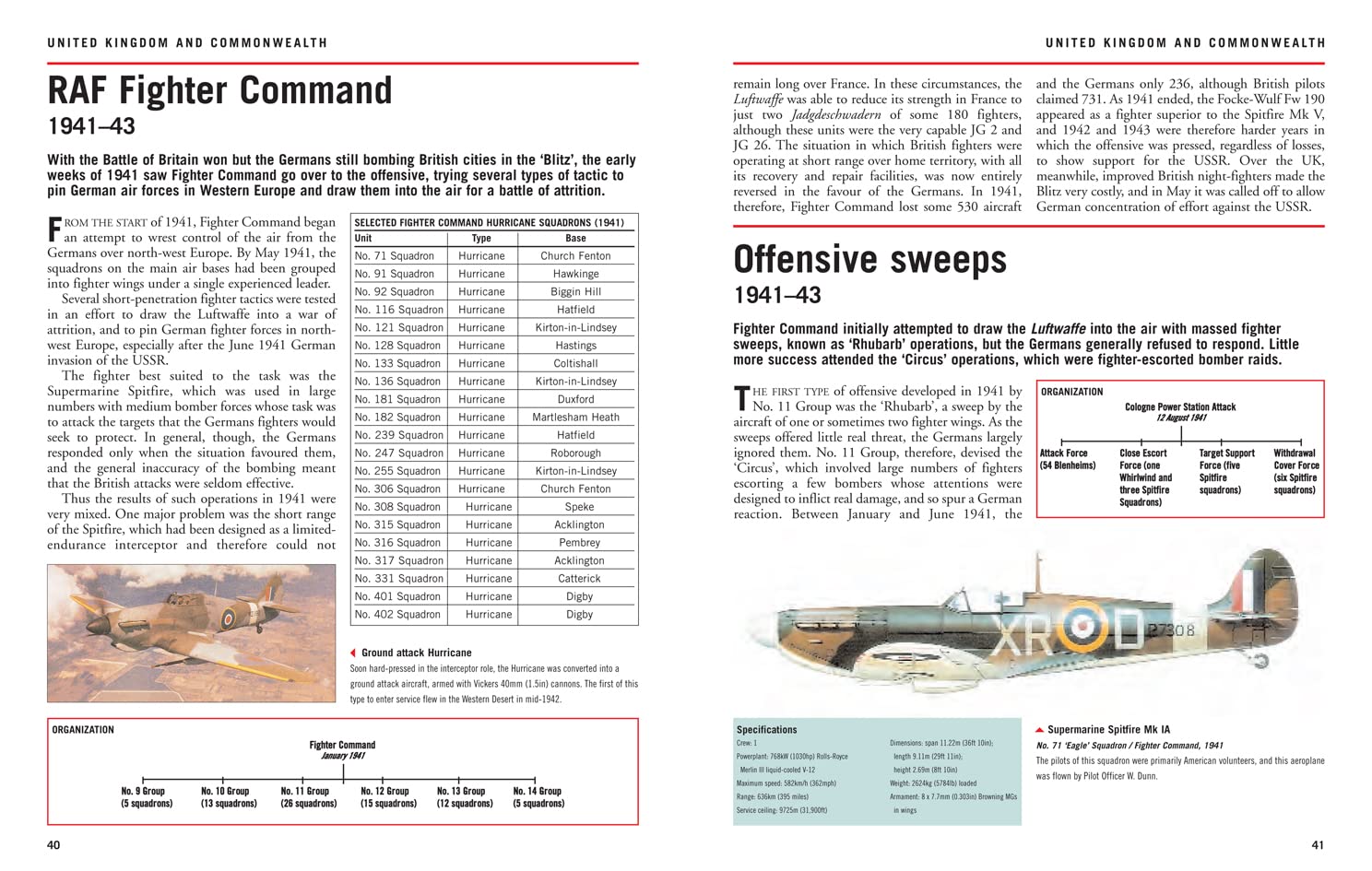 The book also covers aircraft that were used for air-to-air combat (Supermarine Spitfire), ground attack (P-47 Thunderbolt), bomber escort (P-51B Mustang), night defence (Bristol Beaufighter) and photographic reconnaissance (P-38 Lightning).