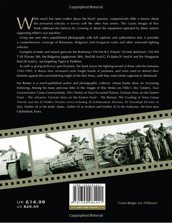 Examples of tanks and assault guns are the Romanian TCAM R-2 (Panzer 35t tank destroyer), TACAM T-38 (Panzer 38t), the Bulgarian Jadgpanzer 38(t), StuG40 Ausf.G, Pz.Kp.IV AusH and the Hungarian StuG.III Ausf.G, not forgetting Tigers & Panthers. As well as giving technical specifications, the book traces the fighting record of these vehicles between 1943 - 1945\.