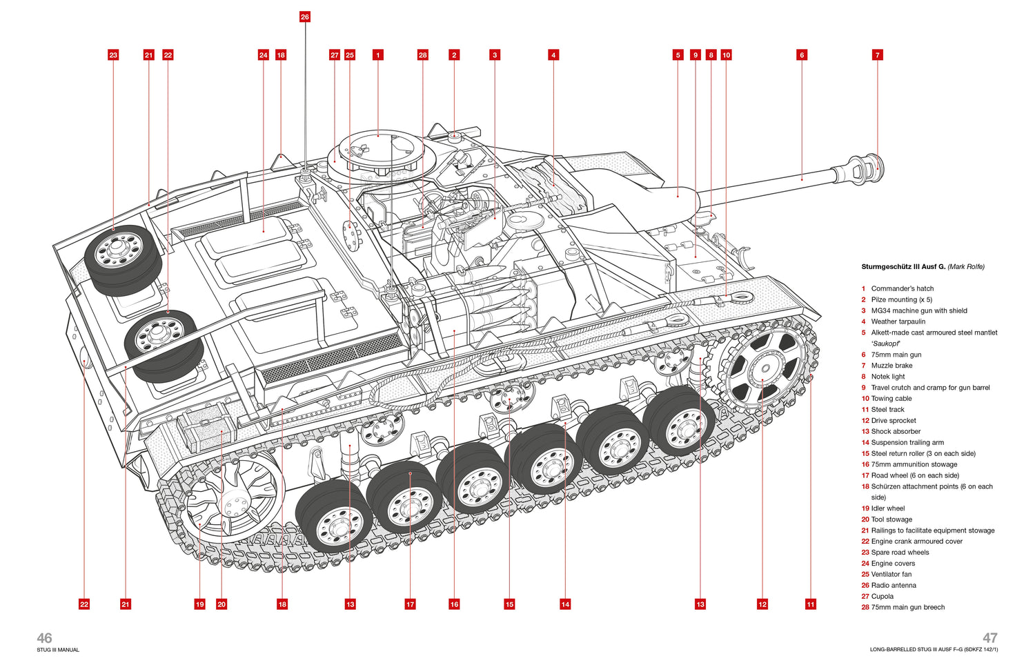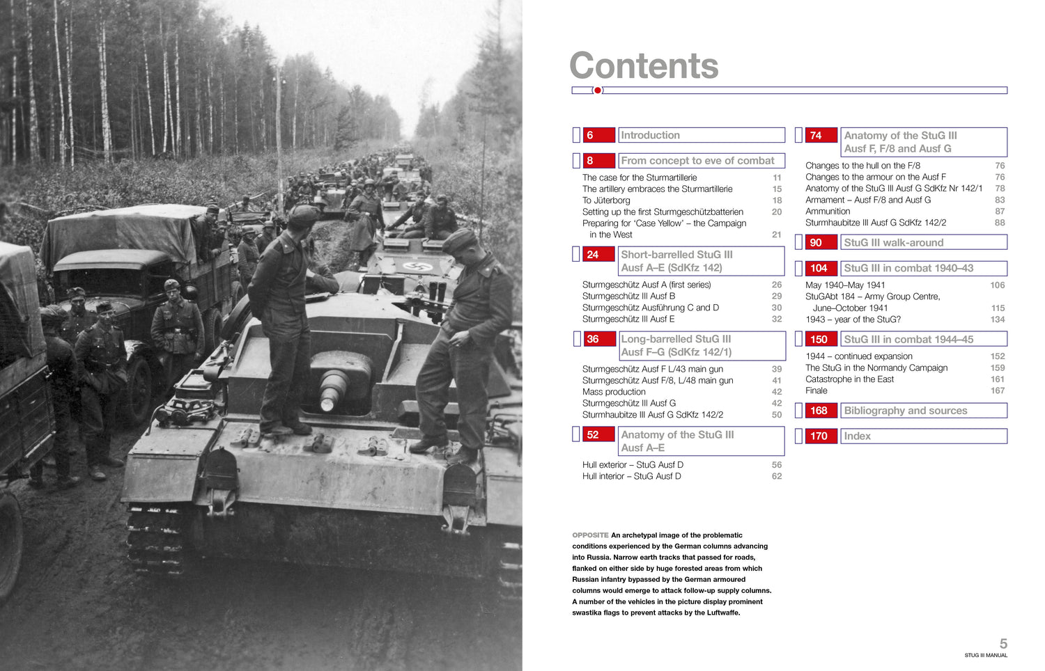 The German Sturmgeschütz series of assault guns was a successful and cost-effective range of armoured fighting vehicles, of which some 10,000 were built during the Second World War. Based on the chassis of the Panzer III tank, the turret was replaced by an armoured fixed superstructure fitted with a more powerful 7.5cm StuK 40 L/48 gun. Originally intended as a mobile assault weapon for infantry support, the StuG was constantly modified and saw extensive use on all battlefronts as an assault gun and tank destroyer. Its fixed superstructure with limited-traverse mounting for the main armament was simpler and cheaper to build than the turret of the battle tank, plus its low height meant it was easy to camouflage and conceal. Towards the end of the war, more StuGs were built than tanks.