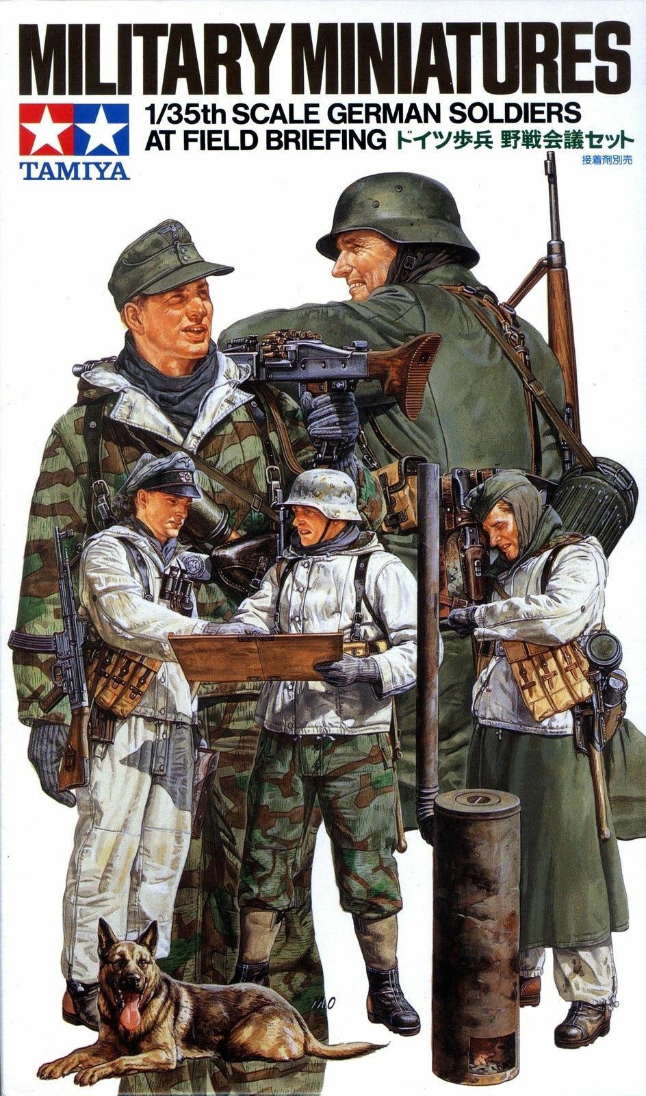 Set contains five figures of Second World War German soldier meeting around a stove. The five figures are: two NCO, Squad leader (Officer), machine gunner and a rifleman and German Shepherd dog. All have highly animated posture and are highly detailed down to the facial expression. Accessories include a field stove and printed matters, such as maps. Weapons included are MG-42 machine gun, two MP44 assault rifles, two G43 rifles and stick grenades.