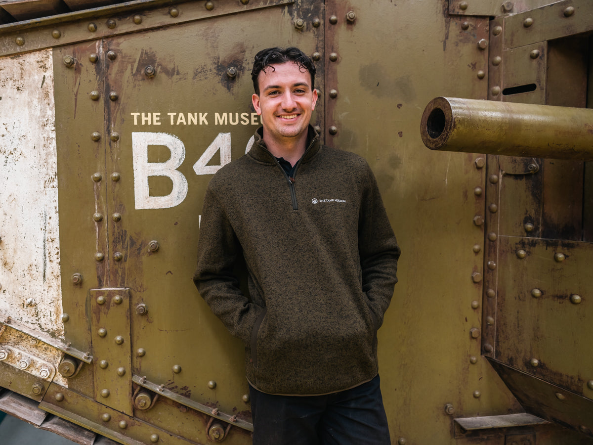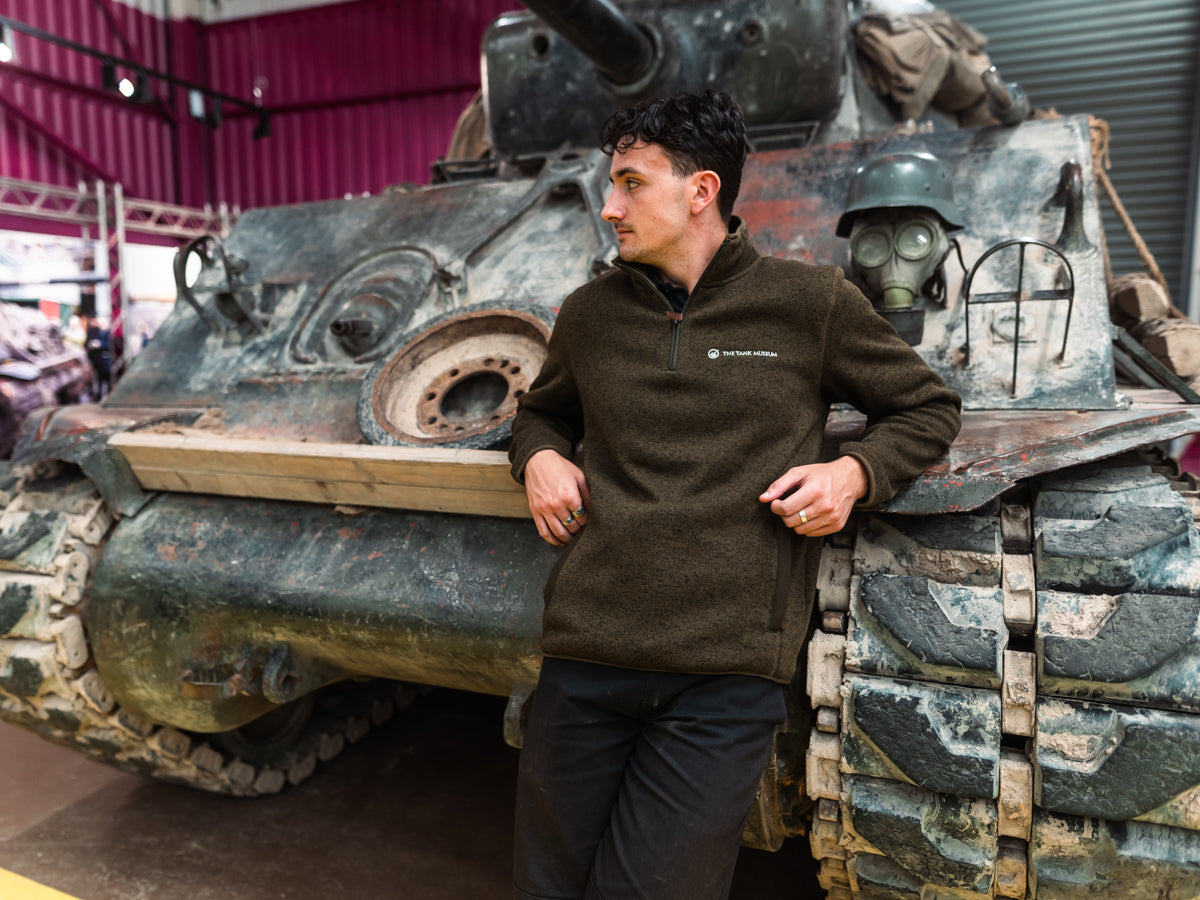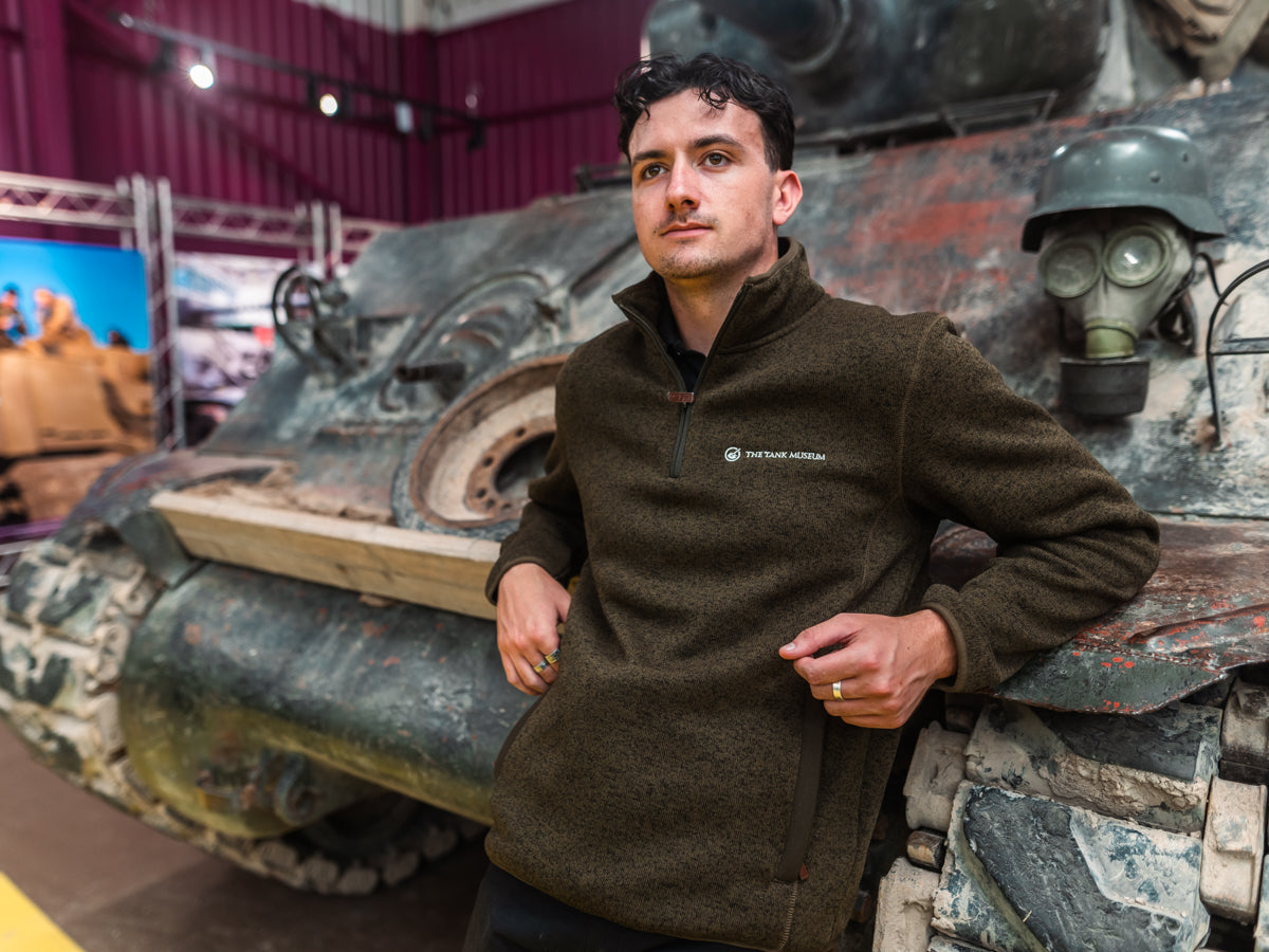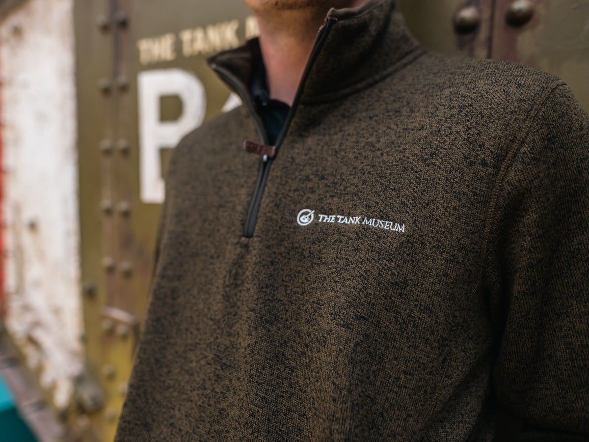 The Tank Museum's new zip neck jumper is comfortable and soft, made of 70% regenerated cotton and 30% polyester. The logo is stitched, not printed, in white.