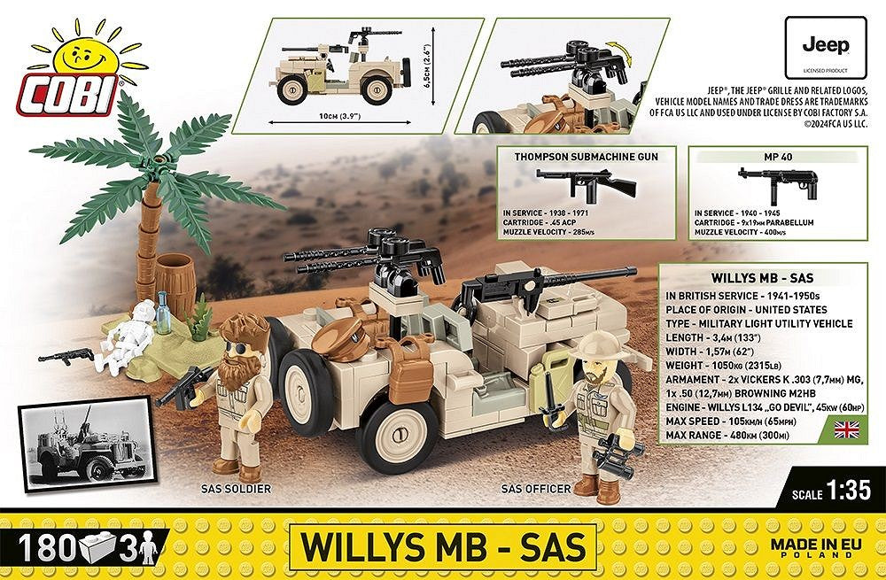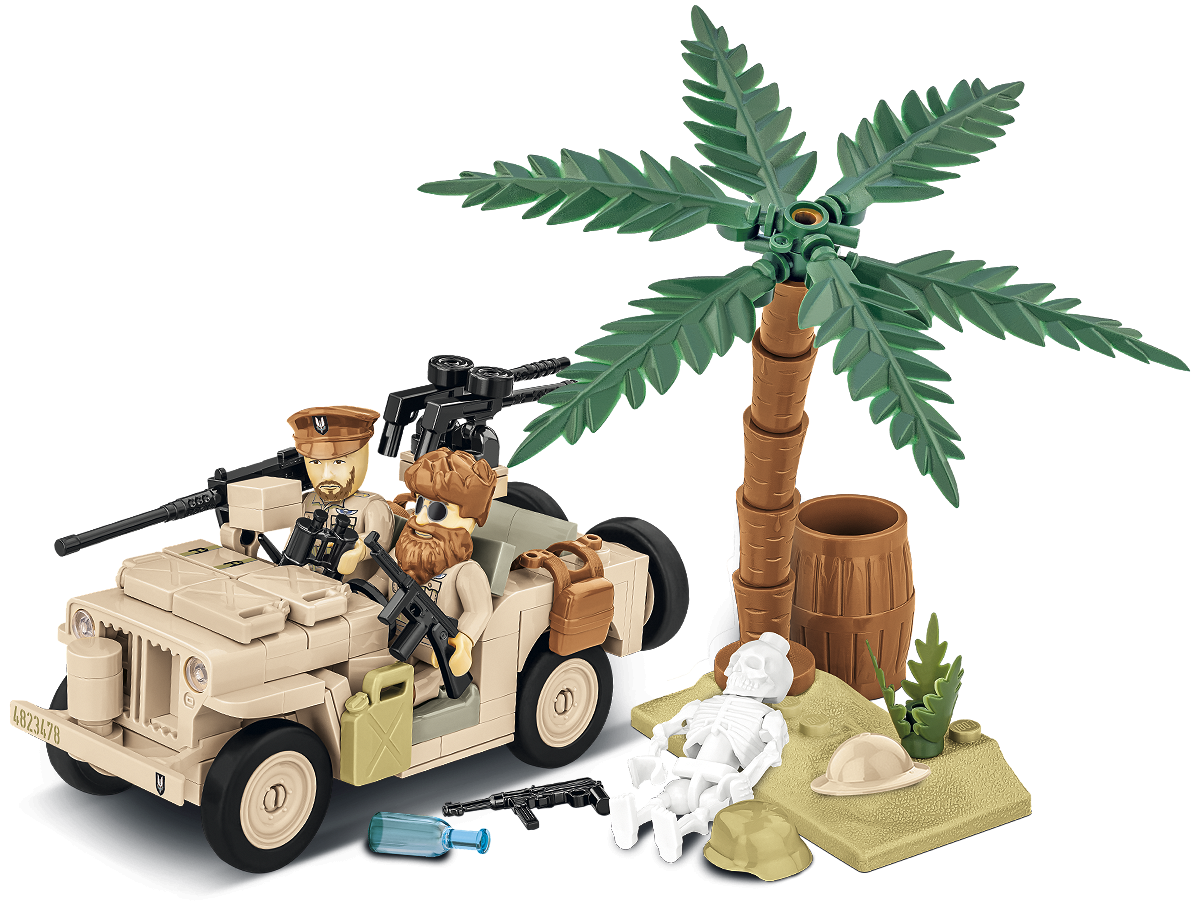 This licensed Willys Jeep was released in the British SAS unit paint scheme. The world's most popular off-road vehicle from the Second World War was designed in 1:35 scale and consists of 180 elements. The presented model differs significantly from those used by the US Army. The extremely characteristic cut-out grill of the vehicle with the condenser is very striking. Such a modification of the stock Jeep allowed it to operate in difficult desert conditions, where it is very easy to overheat! Sand paint and items necessary for survival in the desert placed on the hood and bed distinguish the vehicle and add to its appearance of fighting in Africa. The set includes a skeleton lying under a desert palm tree. Around it there are interesting accessories: helmets, weapons and a bottle.