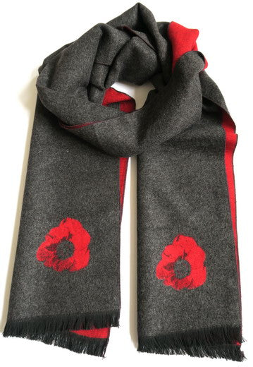 This wonderfully cosy scarf is great to wrapping up warm in winter. The pretty red Poppy design features on a grey marl background, with the colours reversed on the other side, meaning it can be worn a number of ways.